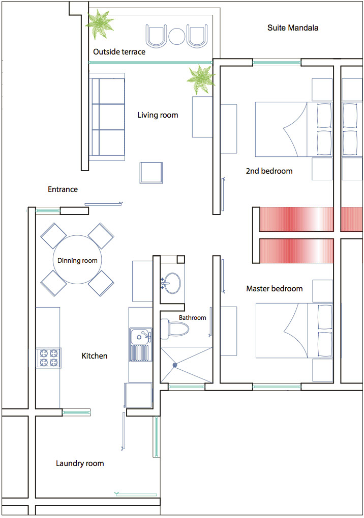 The master bedroom has a queen size bed and the second bedroom a double bed. One sofa bed in the living room, air conditioner in living room and each bedroom, a 32" inches flat screen, ceiling fans in living room and each bedroom, safe-deposit box and laundry room.