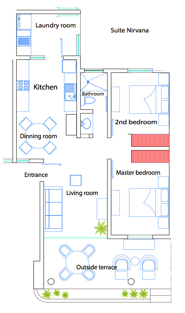 Two bedroom suite on ground floor with private terrace (parking view). Fully furnished, WiFi, cable TV and cookware.