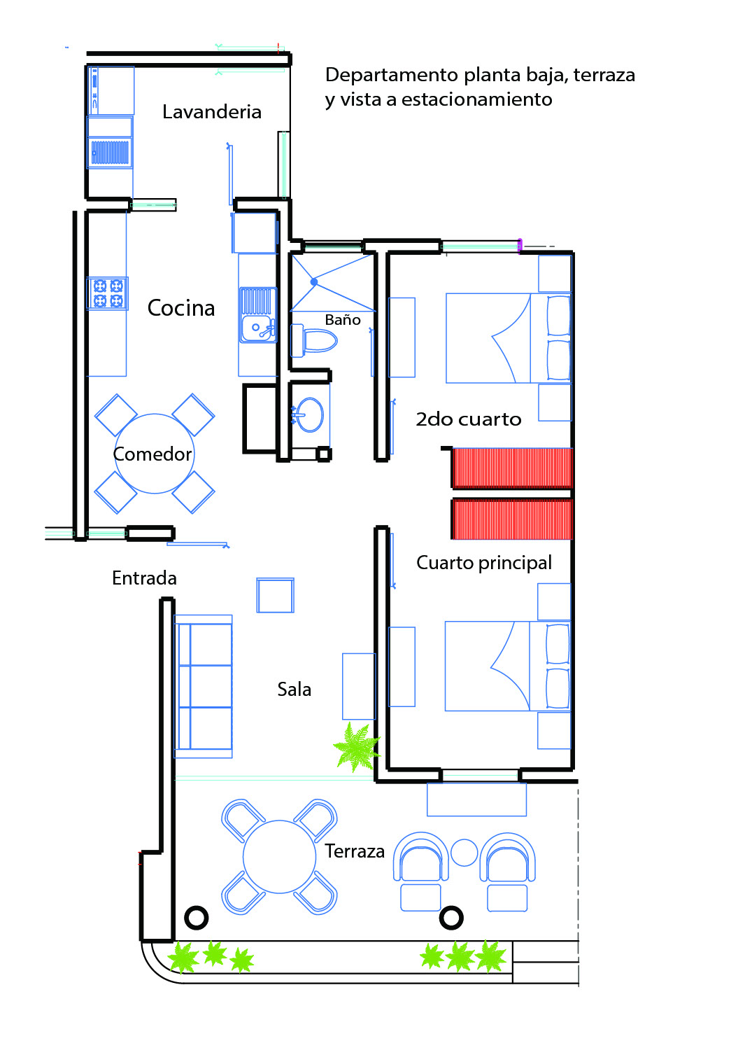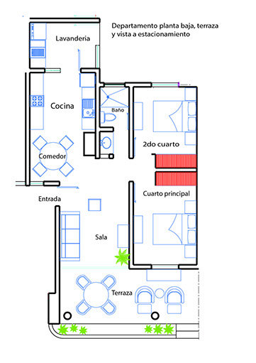 Suite de dos recámaras en planta baja (con terraza privada y vista al estacionamiento) totalmente amueblado, WiFi, televisión por cable y utensilios de cocina. La recámara principal cuenta con cama queen size y la segunda con cama matrimonial, sofá cama en sala, terraza privada amueblada, aire acondicionado en sala y en cada recámara, televisión de 32 pulgadas de pantalla plana, ventiladores de techo en sala y recámaras, caja de seguridad y lavandería. Adaptada para adultos mayores.